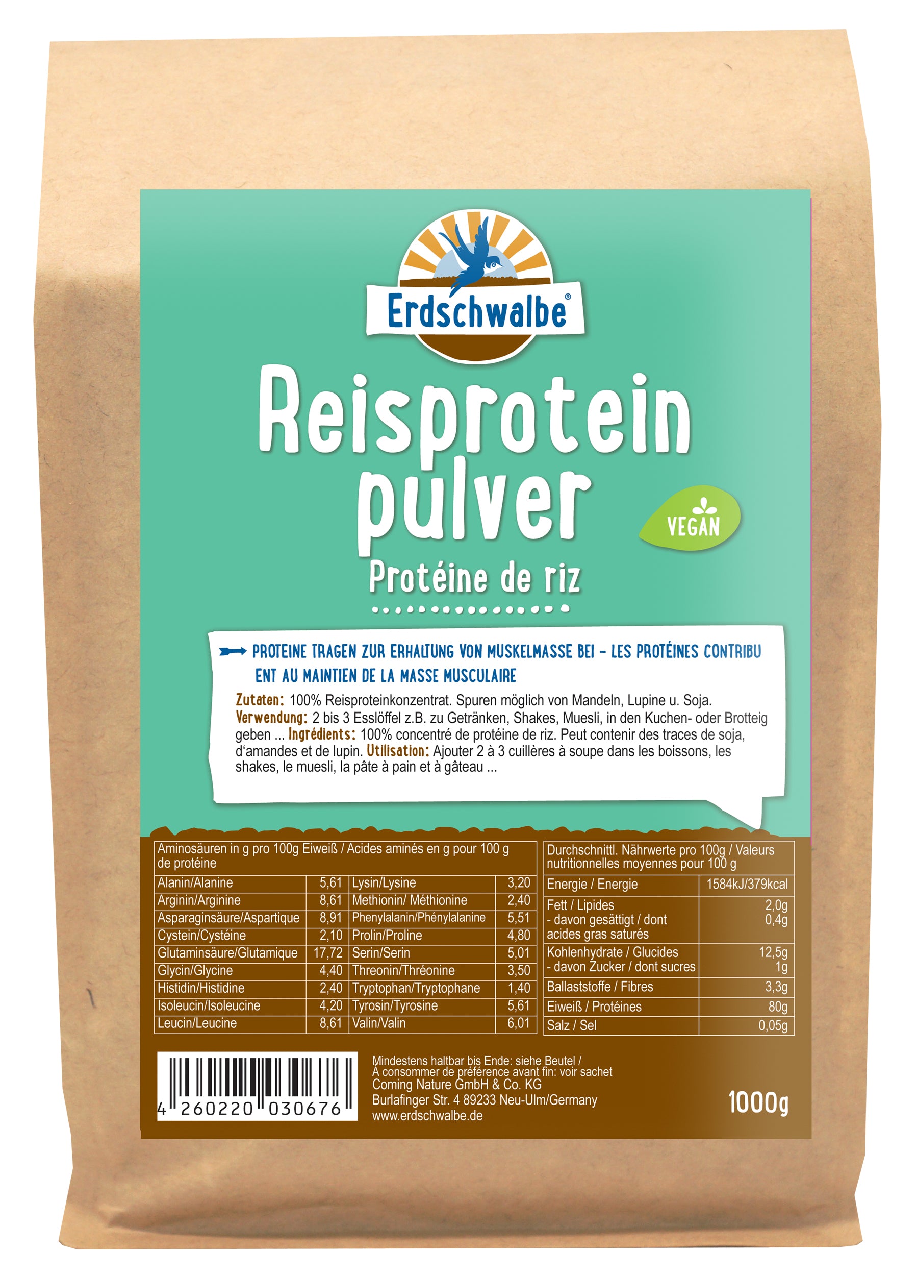 Erdschwalbe Rice Protein / Vegan Protein Powder / 1kg Bag. Ingredients: 100% rice protein concentrate without additives. Features: - 80% plant-based, vegan protein with a high calcium content. Erdschwalbe rice protein contains all eight essential amino acids. The amino acid...