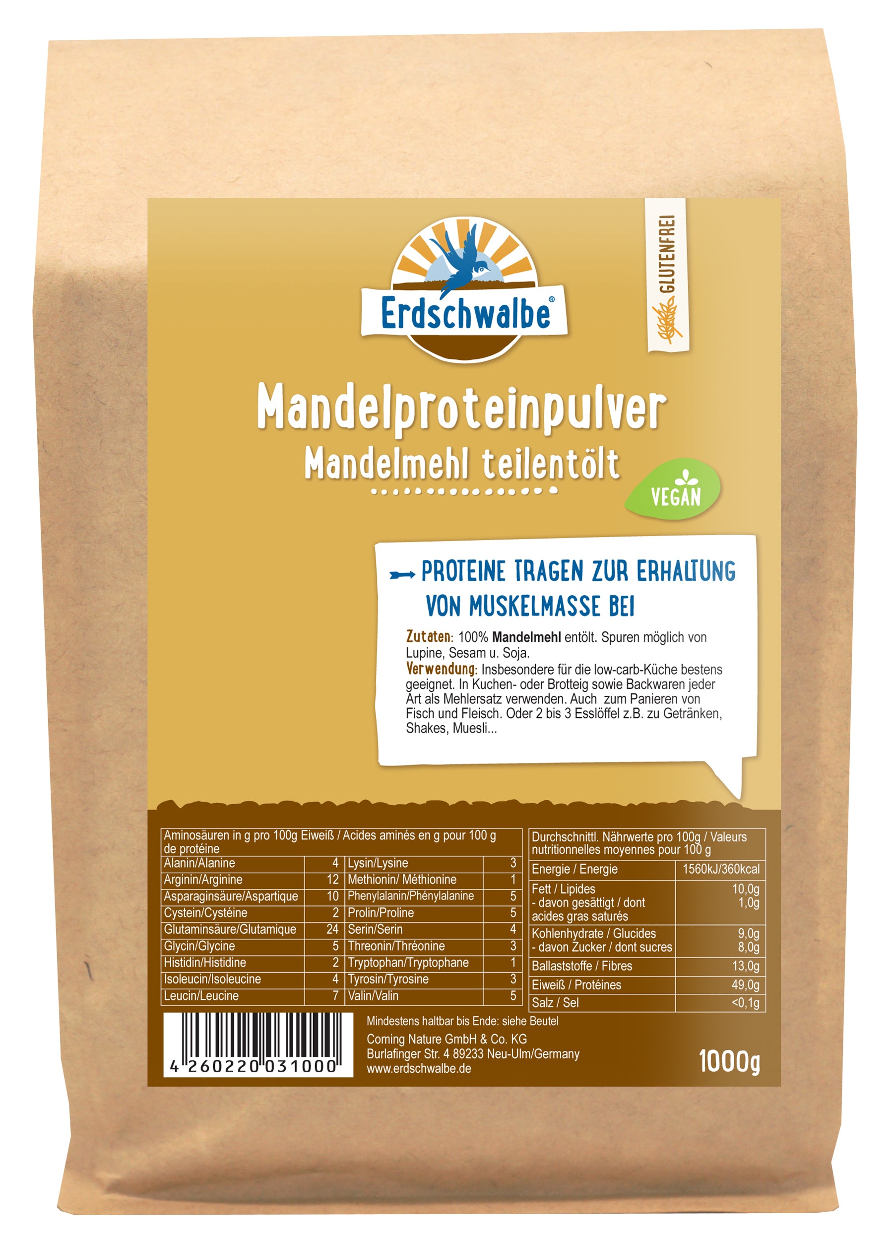 Erdschwalbe Mandelprotein - Mandelmehl teilentölt - Veganes Eiweißpulver - 1 Kg.
